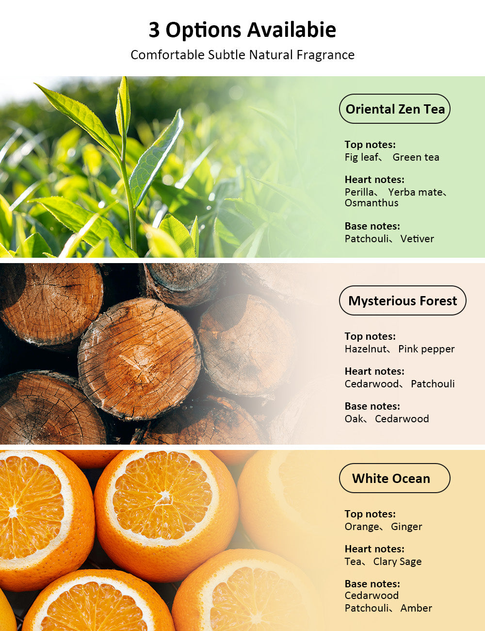 Our car fragrance diffuser offers three distinct fragrances: fruity, tea-inspired, and woody. These are the scents we determined best complement Tesla's interior space after surveying over 5,000 Tesla owners.The fragrance effect lasts for 3 months.