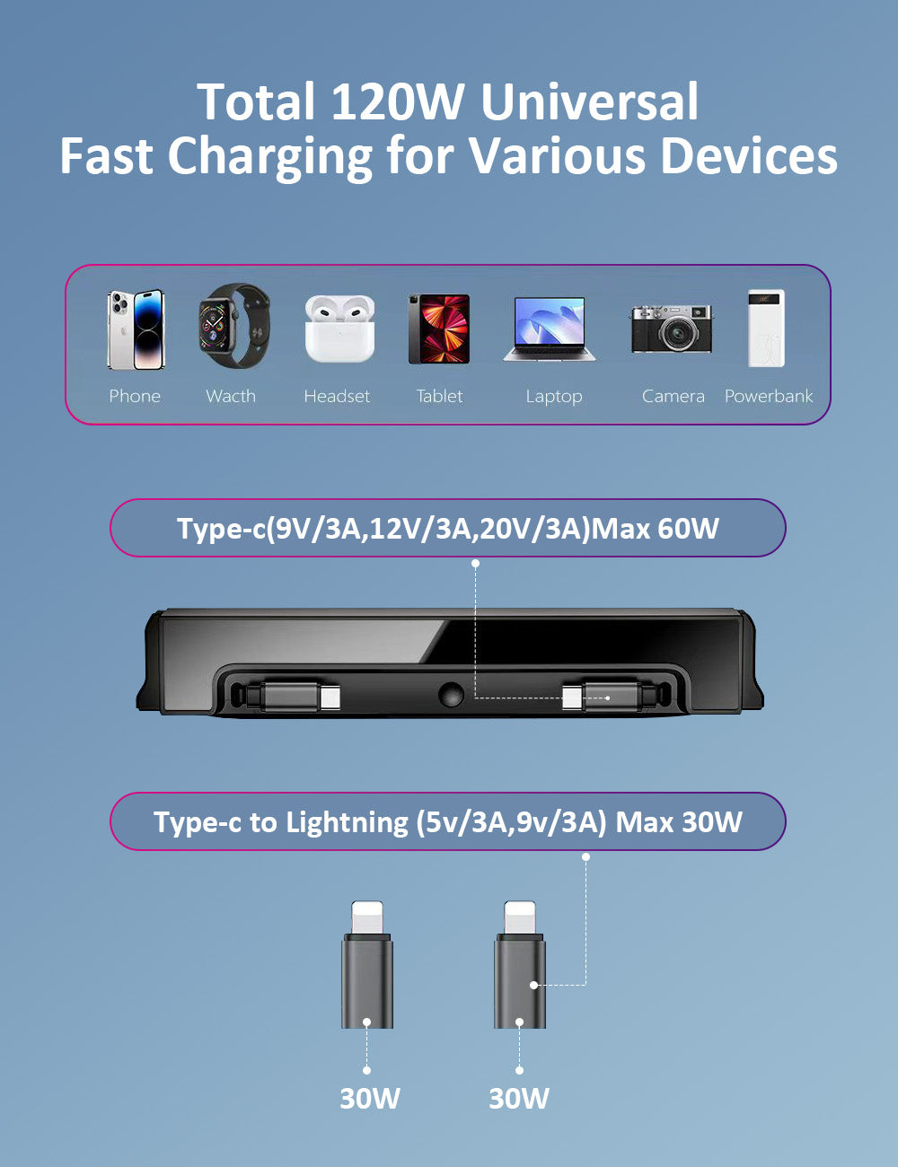 With a total fast-charging capacity of 120W, it can charge your phone from 0% to 60% in just 10 minutes. It supports both Type-C and older iPhone connectors. Install our product and charge up to four phones simultaneously!