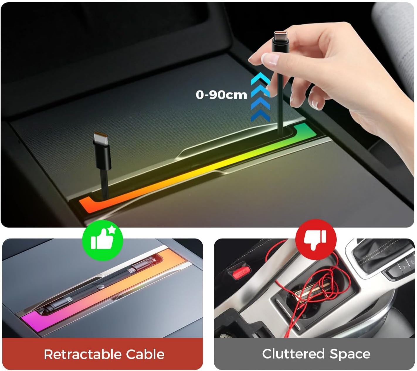 90cm retractable ultra-long charging cable, easily accessible for rear passengers. We've also incorporated a magnetic attachment feature to keep your Tesla console compartment tidy when not in use.
