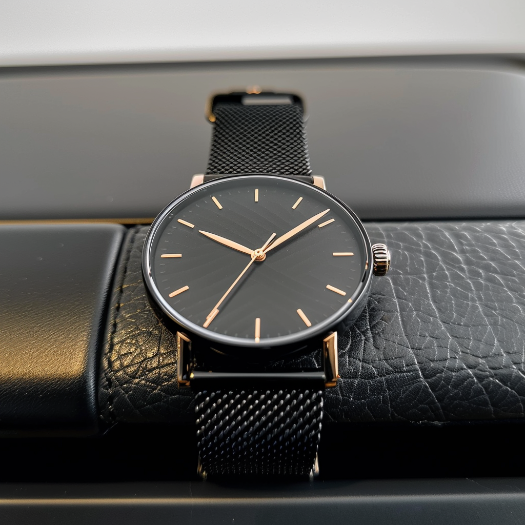 Inspired by the clean lines and futuristic elegance of your Model 3/Y interior, the Yuebbn Model One strips away all distractions.A sleek black textured dial with rose gold hands mirrors the calm precision of your Tesla’s cockpit.No notifications. No subscriptions. Just time—pure and uninterrupted.